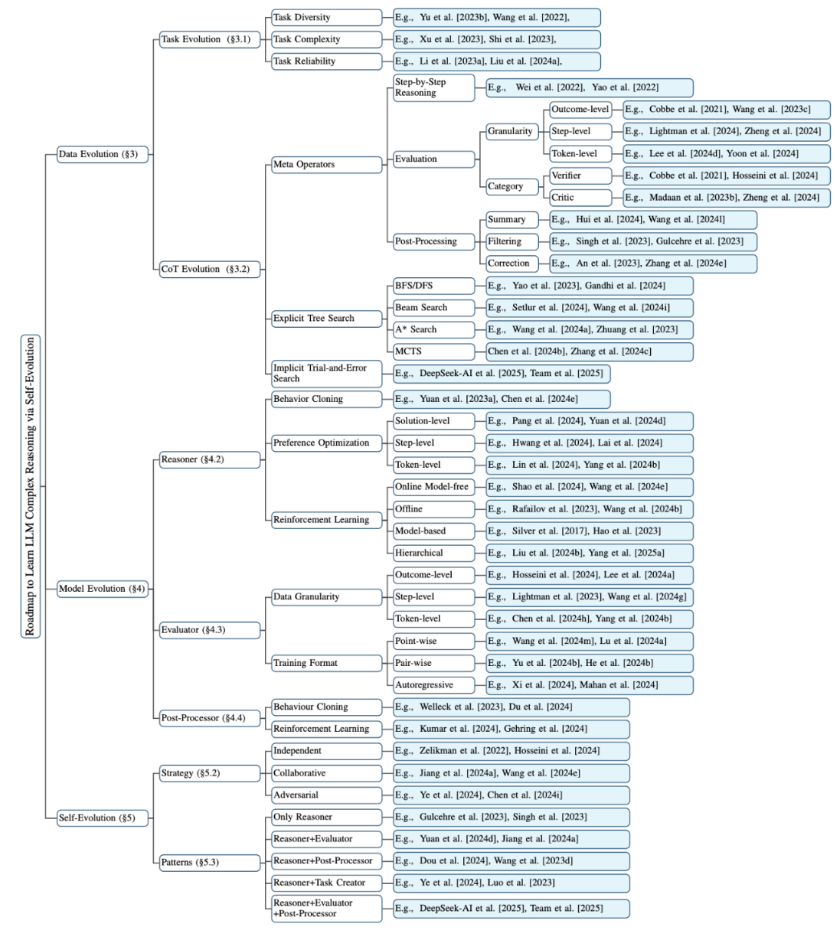 本文将从三个主要部分介绍 LLM 复杂推理的自我进化方法:数据进化、模型进化和自我进化。最后,我们将分析具有代表性的 O1 类工作,并对未来研究方向进行展望。