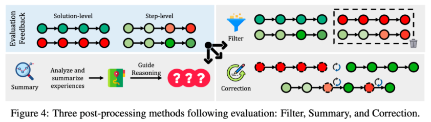 后处理:后处理对推理结果进行修正和总结,使模型能够从错误中学习并改进未来的推理。后处理方法包括过滤、总结和修正。过滤直接移除低质量的推理结果,总结从推理过程中提取关键信息,修正则通过纠正错误来优化推理结果。这些方法通过不同的方式,提高推理结果的质量和可靠性。