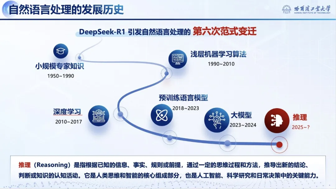 DeepSeek-R1的出现,还引发了自然语言处理的第六次范式变迁,而其中最核心的就是推理采用的思维链技术(Chain-of-Thought, COT)。除此以外,讲座还详细介绍了DeepSeek的强化学习实现的技术细节:GRPO框架、奖励模型、训练的技术路线和模型架构优化技术等。