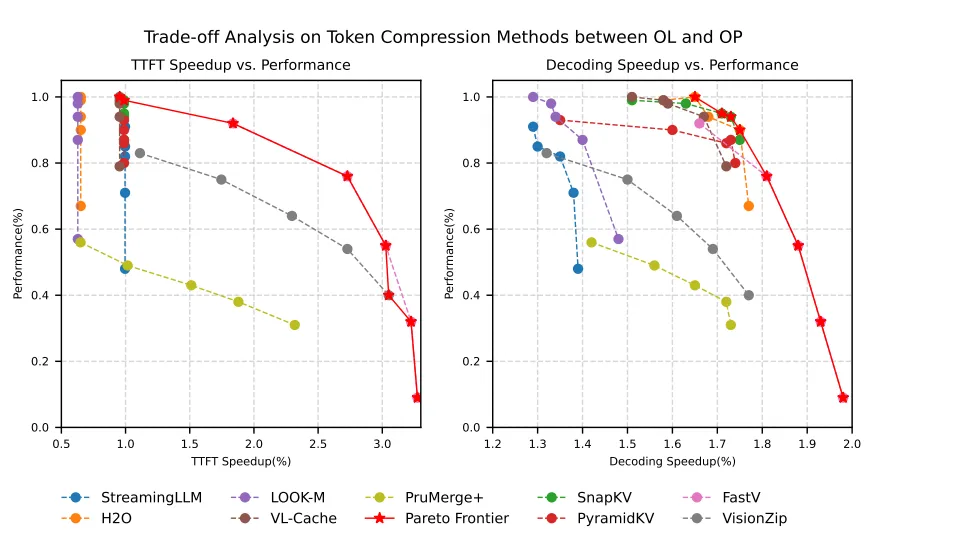 图 2 针对 Token 压缩方法在效率与性能之间的权衡关系