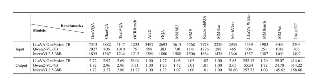 图 1 不同模型在多个 Benchmarks 上的输入输出长度