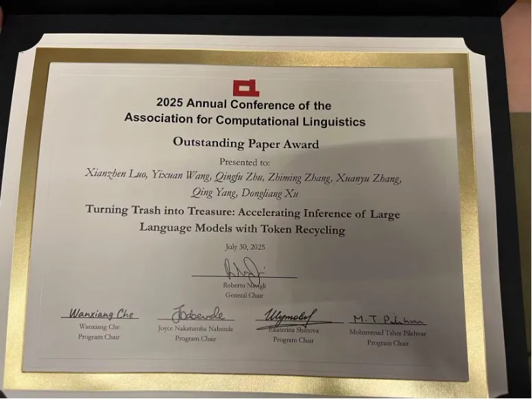 实验室博士生罗先镇获得ACL 2025 杰出论文奖(Outstanding Paper),博士生黄磊获得ACL 2025 SAC Highlight paper奖,博士生赵伟翔的论文入选Oral & Panel Discussion(仅有25篇)。